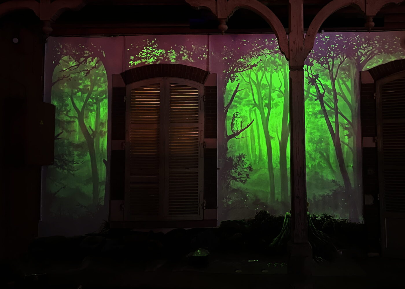 la fresque immersive de SWING LE LAB au parc des Chabrières : une œuvre unique qui mêle peinture murale et lumière, évoluant du jour à la nuit.