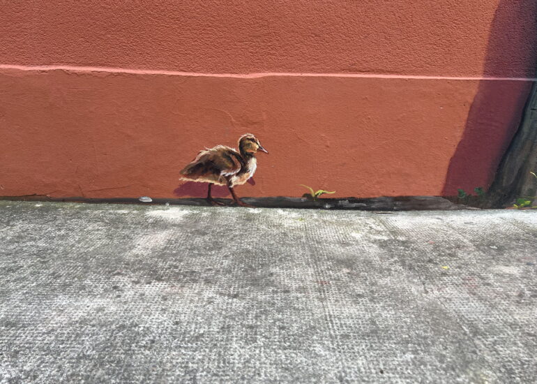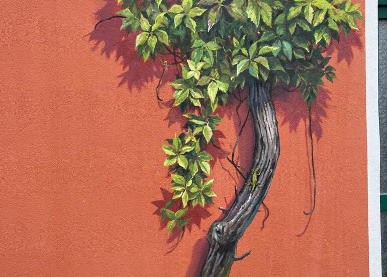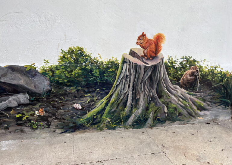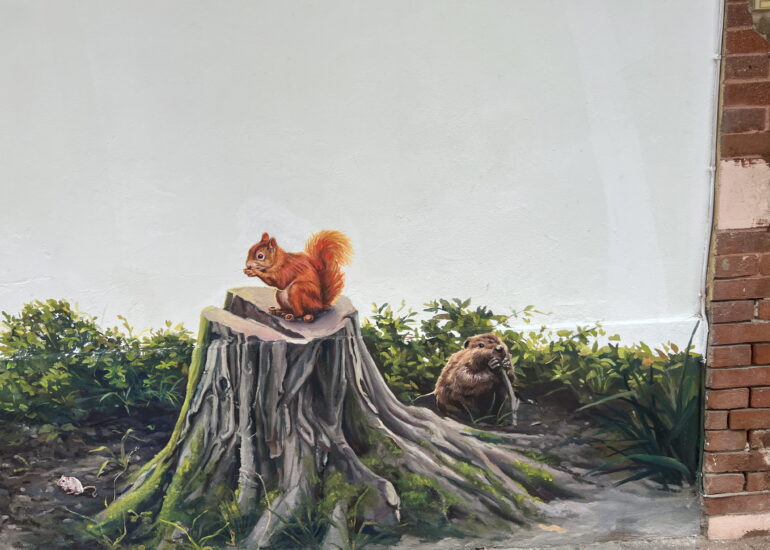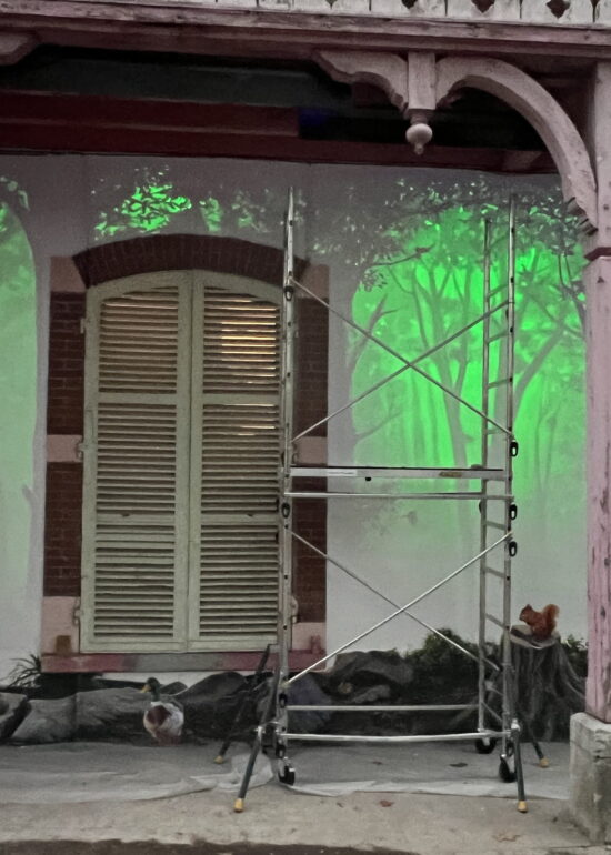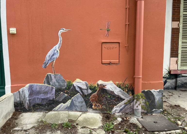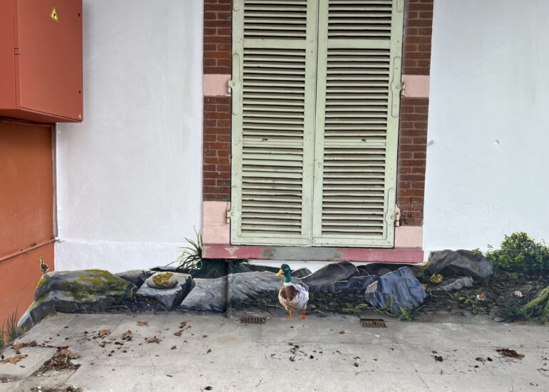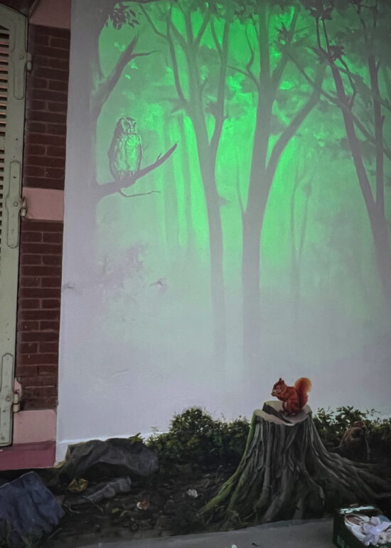 Réalisée pour SWING LE LAB, cette fresque située au cœur du parc des Chabrières fusionne peinture murale et lumière pour une expérience évolutive. Le jour, la faune et la flore de l’Yzeron prennent vie sur le chalet, invitant petits et grands à une découverte ludique et détaillée. La nuit, la surface blanche se transforme en une forêt lumineuse, prolongeant le parc dans une ambiance féérique. Une œuvre qui allie art, nature et innovation, évoluant au rythme du jour et de la nuit.