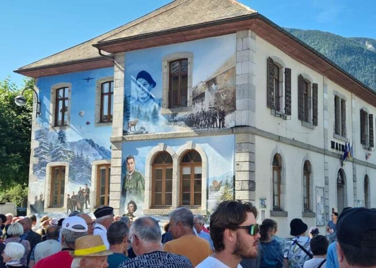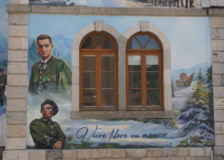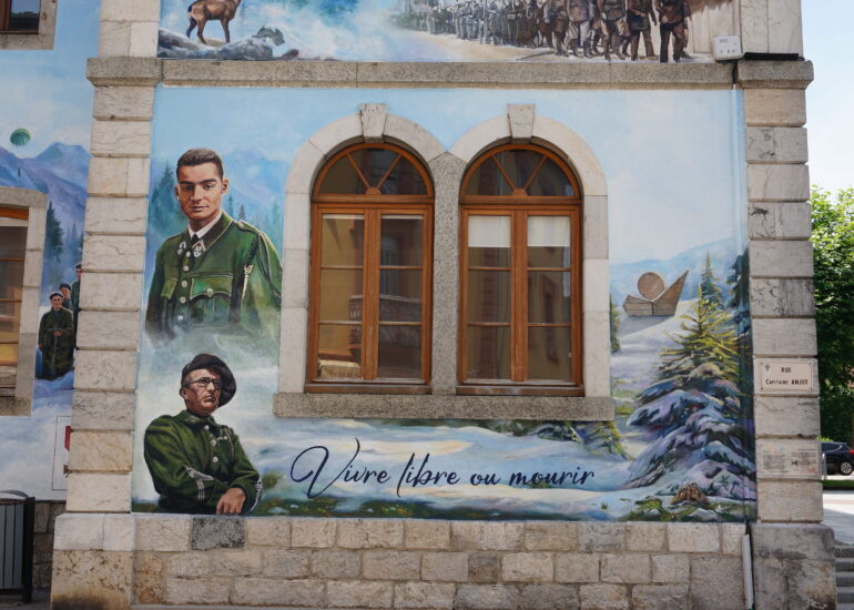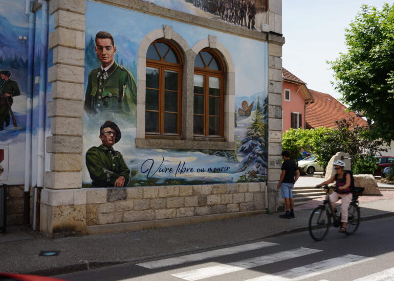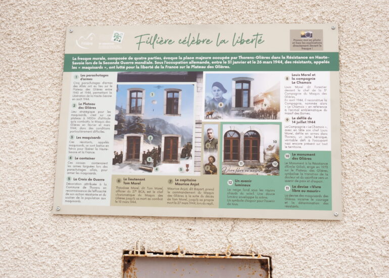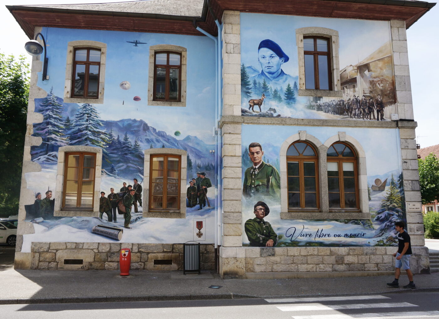 Une fresque monumentale à Thorens-Glières, un hommage vibrant aux maquisards du Plateau des Glières, résistants de la Seconde Guerre mondiale. Une œuvre historique qui illumine le patrimoine local et perpétue la mémoire de ces héros.