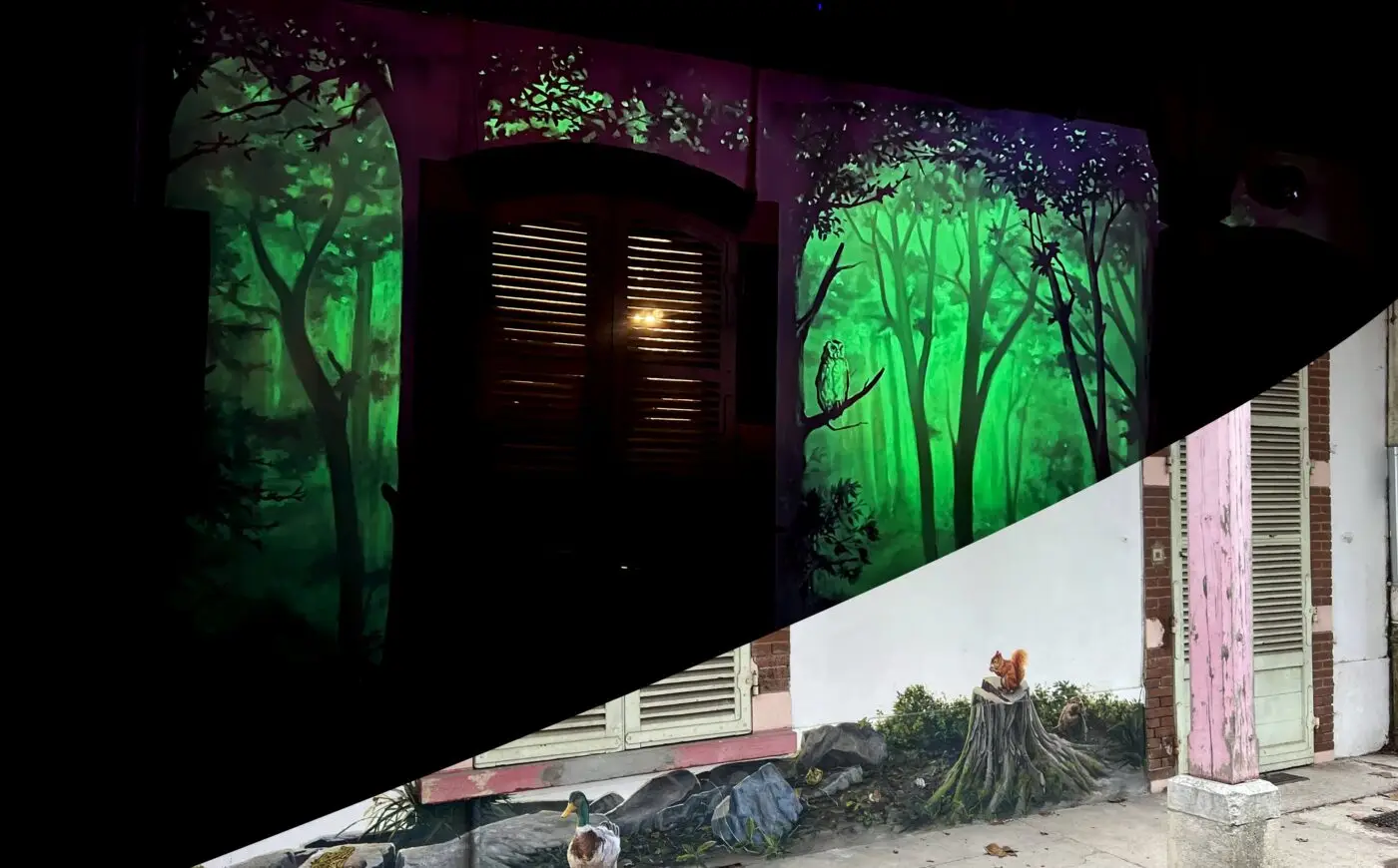 Réalisée pour SWING LE LAB, cette fresque située au cœur du parc des Chabrières fusionne peinture murale et lumière pour une expérience évolutive. Le jour, la faune et la flore de l’Yzeron prennent vie sur le chalet, invitant petits et grands à une découverte ludique et détaillée. La nuit, la surface blanche se transforme en une forêt lumineuse, prolongeant le parc dans une ambiance féérique. Une œuvre qui allie art, nature et innovation, évoluant au rythme du jour et de la nuit.