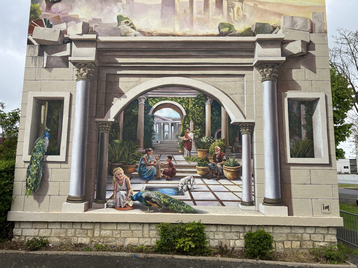Située au 26 boulevard Alexandre Dumas, cette fresque commandée par L’Opal met en valeur l’histoire du quartier Saint-Crépin et ses découvertes archéologiques. Inspirée des vestiges de domus romaines, elle reconstitue ces demeures antiques tout en intégrant une scène familiale, symbole du lien intergénérationnel et du cadre d’habitat social.